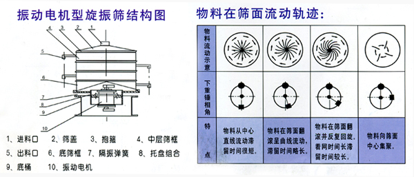 S49振動(dòng)電機(jī)旋振篩是通過立式振動(dòng)電機(jī)直接傳動(dòng),使篩體產(chǎn)生復(fù)旋型振動(dòng),此振動(dòng)軌跡為—復(fù)雜的空間立體曲線,從而使篩體產(chǎn)生篩分作用。調(diào)節(jié)上下重錘的空間相位角,可以改變物料在篩面上的運(yùn)動(dòng)軌跡。